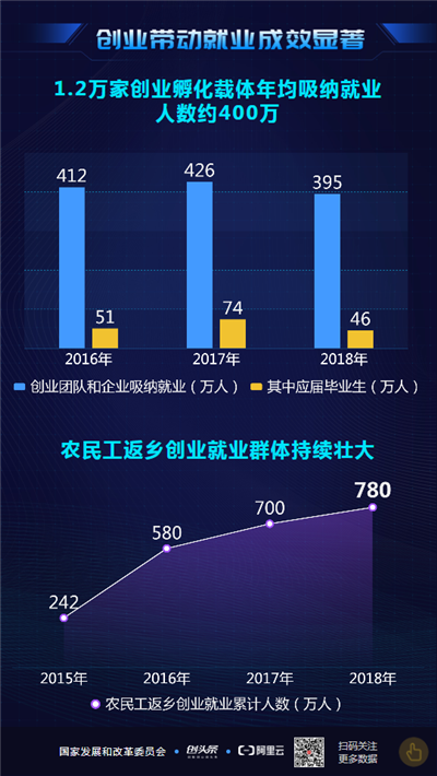 第四,创新带动就业成效显著。1.2万家创业孵化载体年均吸纳就业人数约400万人,其中应届毕业生占比超过14%。重点就业群体中,农民工返乡创业就业群体持续壮大,截止2018年,各类返乡下乡创新创业人员累计达780万,返乡下乡人员50%以上利用信息技术创新创业,近90%是联合创业,创新创业热潮带来了巨大的社会效益。