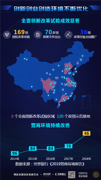 第一,创新创业环境持续优化。近年来,我国全面创新改革试验成效显著, 8个全面创新改革试验区总计完成了169项授权改革举措,70多项政策文件的出台,36项改革经验全国推广,更在全国布局建设了120家双创示范基地。从整个世界经济情况来看,2018年我国营商环境在190个经济体中位列第46位,比上年提升32位,名次提升是近些年来最为显著的一次。